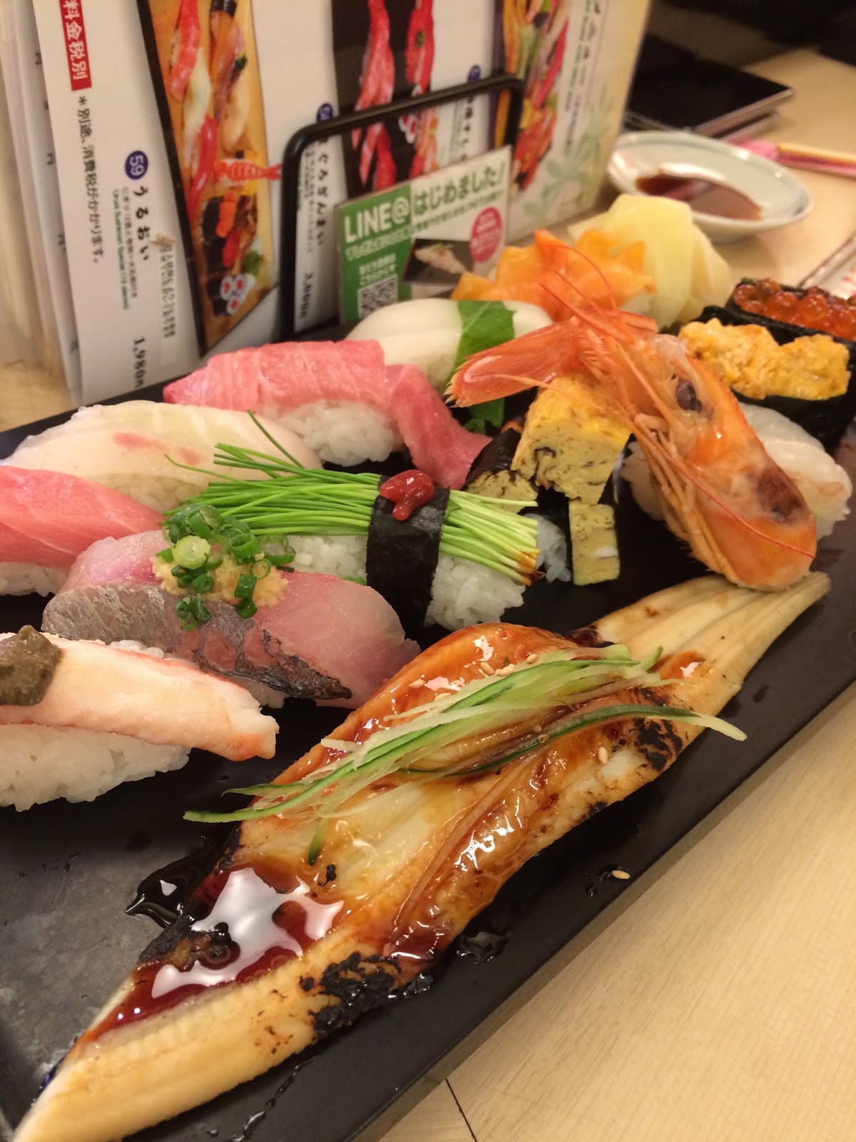 After the performance, we were in search for food. Since Akemi wasn't hungry, we decided on a sushi restaurant. OMG, the portions were huge! Here's my anago sushi. Its my favorite here in Japan, but when the sushi chef asked if I wanted it small or large, I didn't know what he was asking. So Paul answered for me and chose large. Man, there wasn't enough rice for how much anago there was! The piece was as long as the chopstick!
